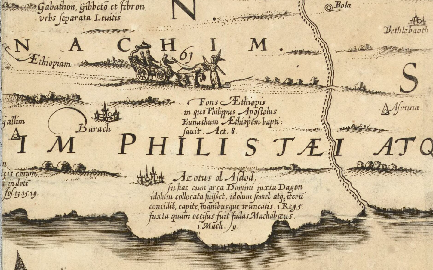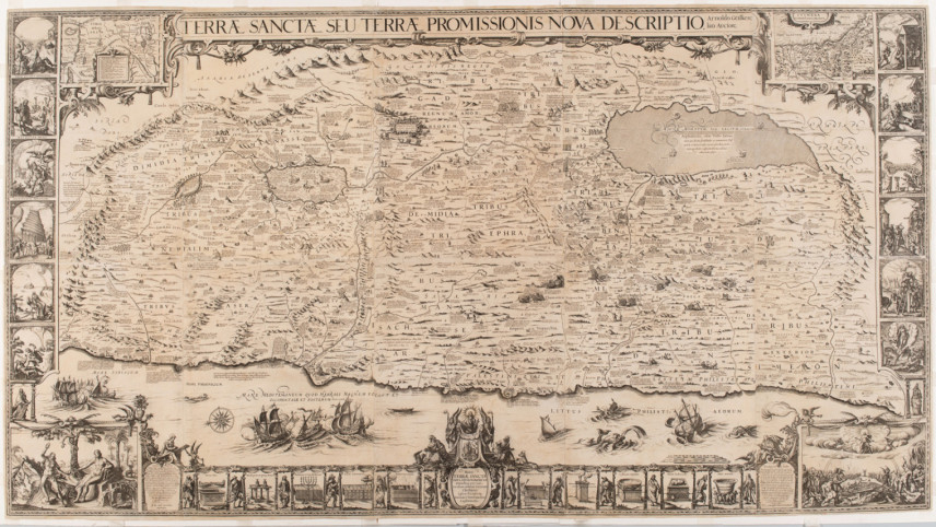 Одна из самых ярких, цветных, настенных карт в экспозиции была напечатана амстердамцем Юстусом Данкертсом и раскрашена его сыном Корнелисом II; она известна в единственном экземпляре и датируется периодом между 1696 и 1701 годами. Карта была создана на основе «Новой карты Земли обетованной и Святого города Иерусалима с основными библейскими историями Ветхого и Нового заветов» картографа и художника Йоханеса ван Дотекюма-младшего (Амстердам, 1641).