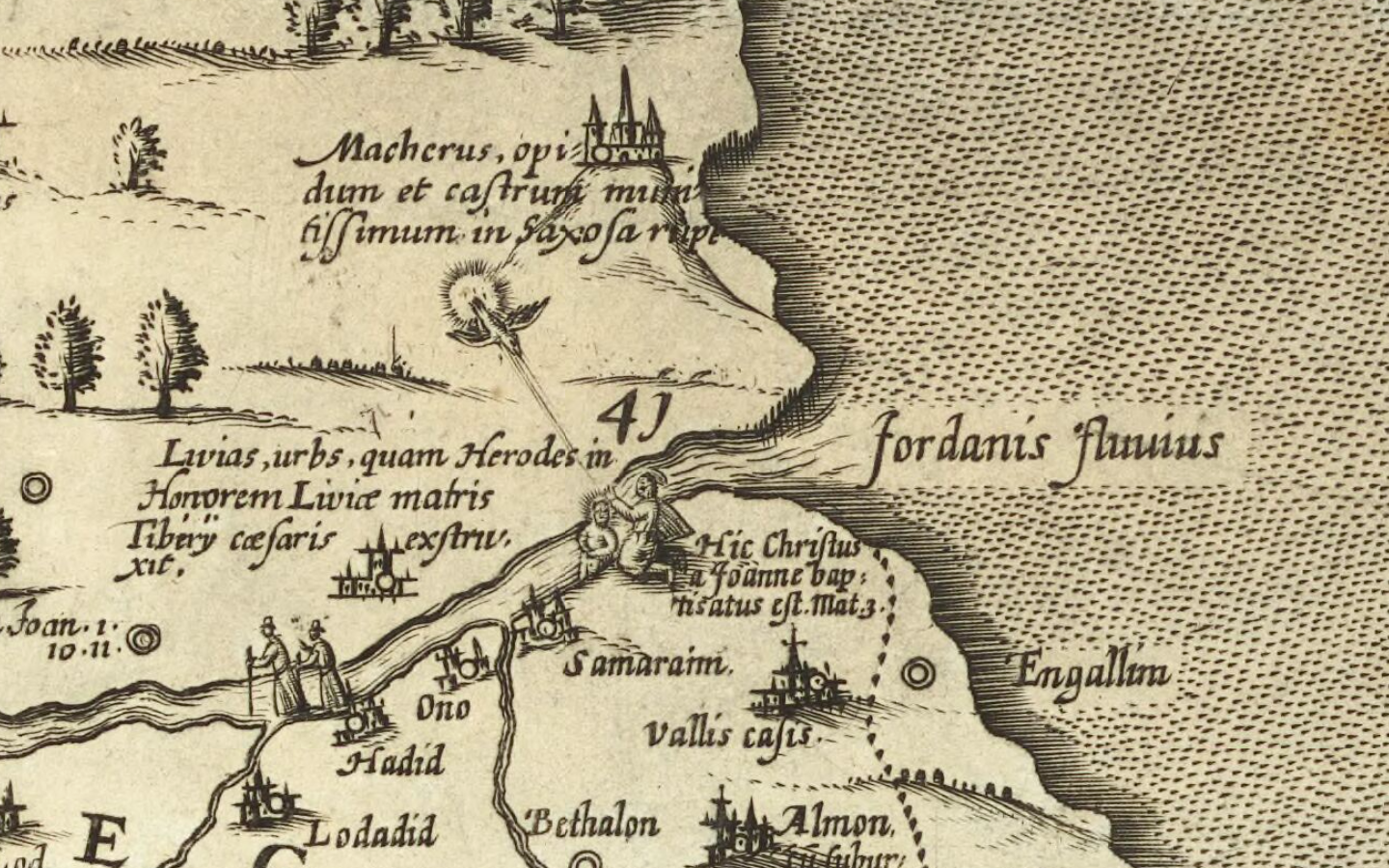 ↑ Фрагменты карты братьев ван Геелкеркен Terrae Sanctae seu Terrae Promissionis nova descriptio, изданной в 1631 году Яном Янсоном (1588–1664) в Амстердаме / Bibliothèque nationale de France / Добросовестное использование ↑