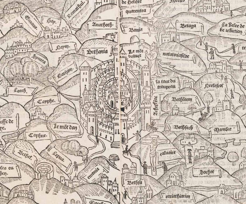 Самым абстрактным и поэтическим вариантом выглядит карта Жана дю Пре, печатника из Лиона, создавшего карту Иерусалима как приложение к изданию La mer des histoires, впервые напечатанному в Париже в 1488 году. Это гравюра на дереве из двух частей, склеенных не вполне ровно. Карта представляет землю как священное пространство, где прошлое и настоящее переплетены, и ветры дуют со всех сторон света. Этот эффект достигнут за счет включения библейских сцен рядом со средневековыми топонимами. Изображение по сути отражает главную задачу паломничества в Святую Землю: возможность ощутить себя непосредственным участником священной истории.