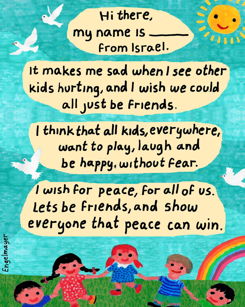 Энгельмайер не только картинками с комментариями и своим человеческим примером поддерживает людей, он в буквальном смысле дает им голос, в каком-то смысле «учит говорить» тех, кому не хватает слов. В конце сентября в своих соцсетях он опубликовал письмо подписчицы, просившей нарисовать открытку-письмо для тех, кто летит в отпуск за границу, но тревожится, зная о том, как встречают израильтян из-за войны, и хотел бы как-то объяснить людям свою позицию. И художник рисует открытку, полную лиц и слов, где объясняется, что «Мы не выбираем место своего рождения, но мы выбираем сострадание». После «полезной открытки для израильтян за рубежом», он получает еще одну просьбу, уже из Америки, о такой же открытке для маленьких детей, которые не знают, что происходит в Израиле. И он рисует открытку с детьми и радугой, которая начинается со слов: «Привет! Меня зовут … из Израиля». И дальше о том, что дети повсюду хотят мира, хотят дружить и быть счастливыми.