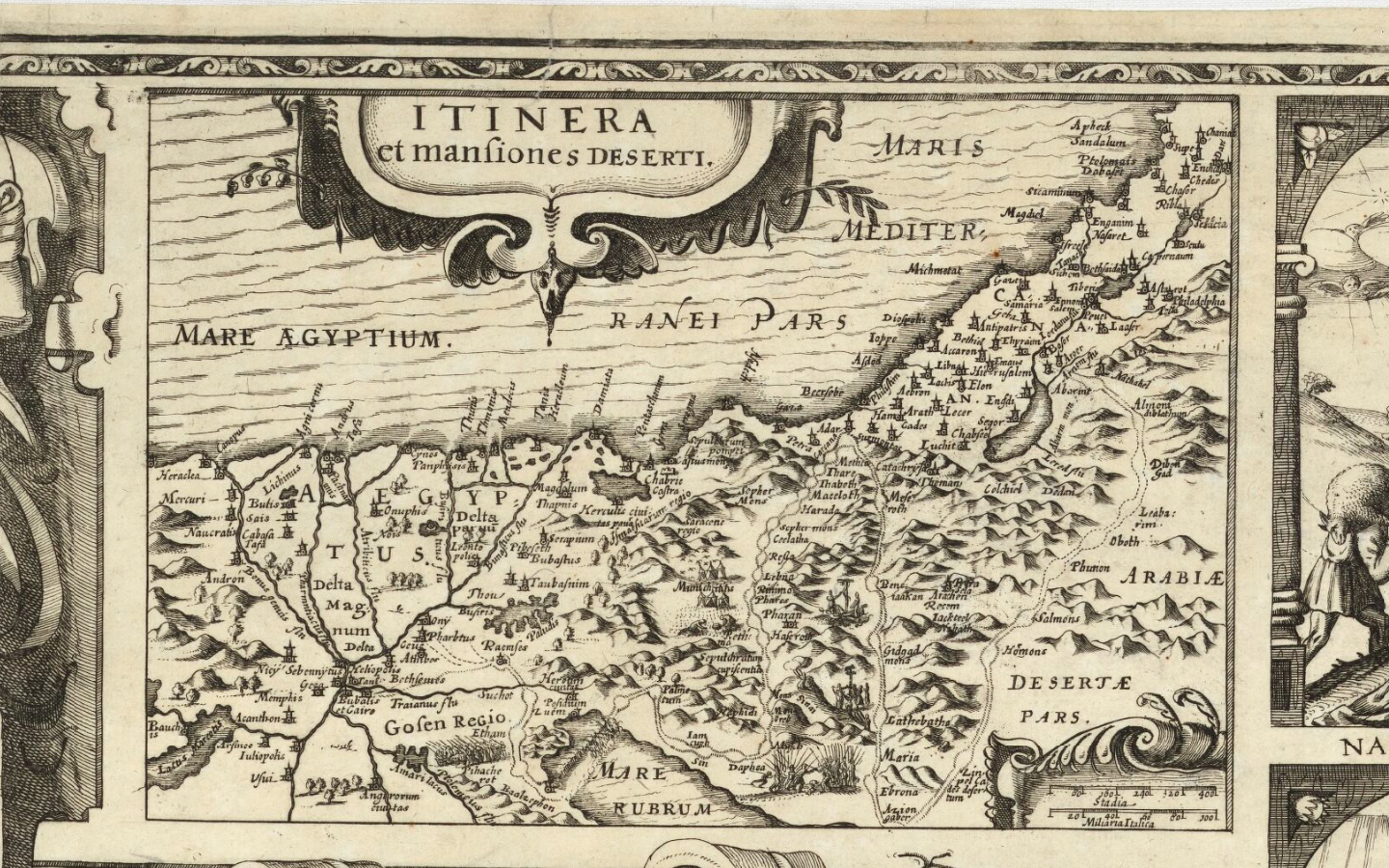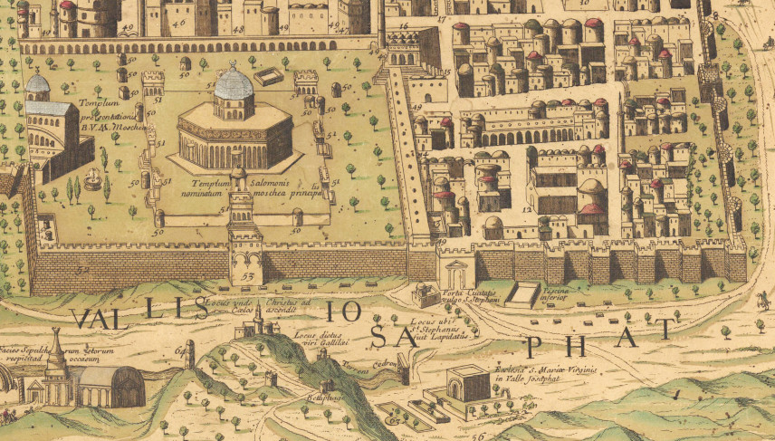 Кроме того, на выставке можно увидеть весьма замысловатый вариант работы Кристиана ван Адрихема, где сочетаются библейский нарратив и топография, и абсолютно реалистичную карту францисканца, отца Паулюса а Милонико-младшего, напечатанную в Париже в 1687 году и посвящённую королю Франции как главе ордена францисканцев. По карте Милонико можно и сегодня виртуально совершить Крестный ход: все остановки на виа Долороса уже обозначены, картограф опирался на личное знание города. Под картой находится обширная легенда, разделённая на восемь столбцов, которая перечисляет все места Иерусалима внутри стен; ещё почти сотня подписей на карте указывает на важные места, связанные с христианской традицией за пределами города.