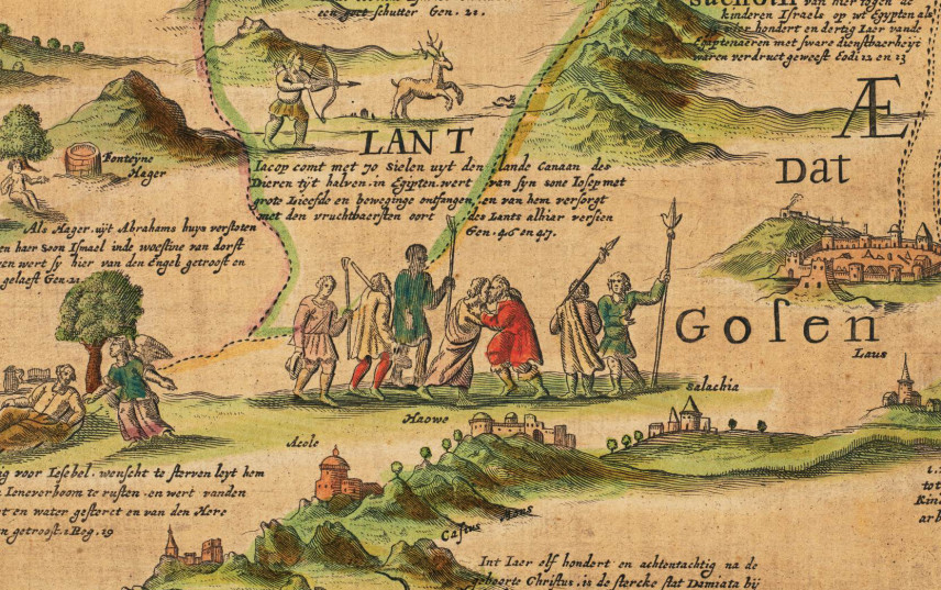 Одна из самых ярких, цветных, настенных карт в экспозиции была напечатана амстердамцем Юстусом Данкертсом и раскрашена его сыном Корнелисом II; она известна в единственном экземпляре и датируется периодом между 1696 и 1701 годами. Карта была создана на основе «Новой карты Земли обетованной и Святого города Иерусалима с основными библейскими историями Ветхого и Нового заветов» картографа и художника Йоханеса ван Дотекюма-младшего (Амстердам, 1641).
