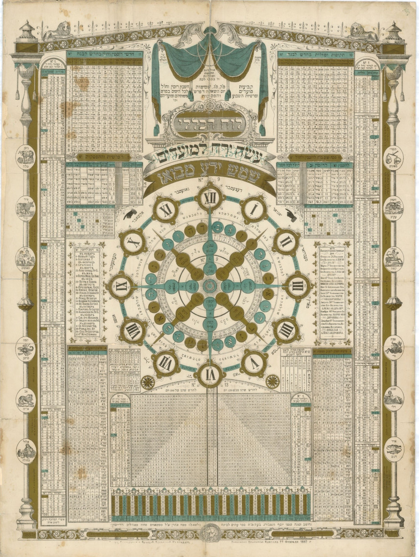 Иосиф Гинцбург. «Вечный вседенный календарь». Варшава, типогр. Авраама Бомберга. 1887. Содержит таблицы расчета лунного и солнечного циклов, соответствия дат еврейского, юлианского и григорианского календарей, а также даты православных праздников и торжественных дней с 1740 года. Из коллекции Музея истории евреев в России.
